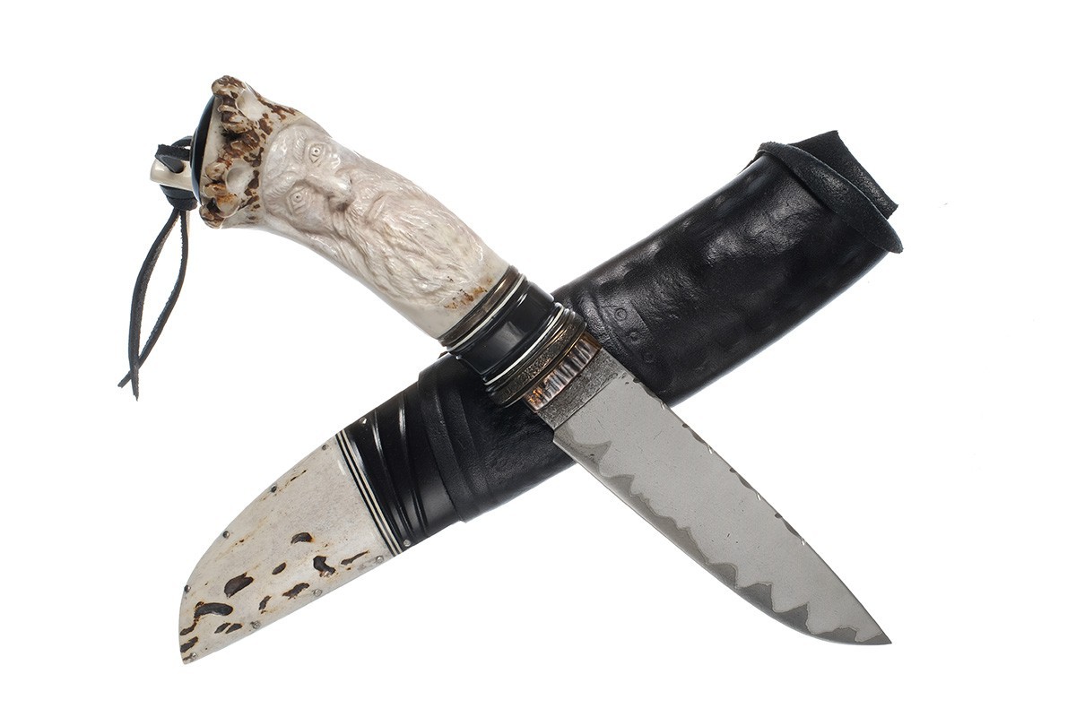 | Материал ножен: | чёрный граб, рог лося, кожа |