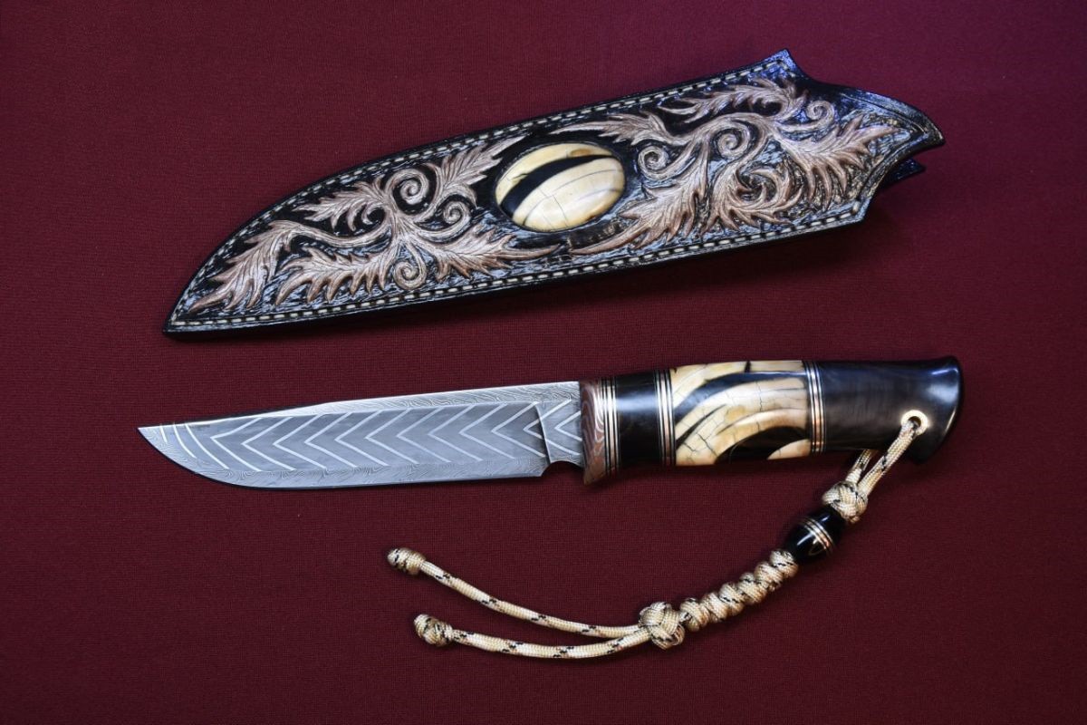 Ножны - итальянская кожа растительного дубления 3.5 мм, композитный вкладыш, стабилизированный бивень мамонта, тиснение, покраска, пропитка