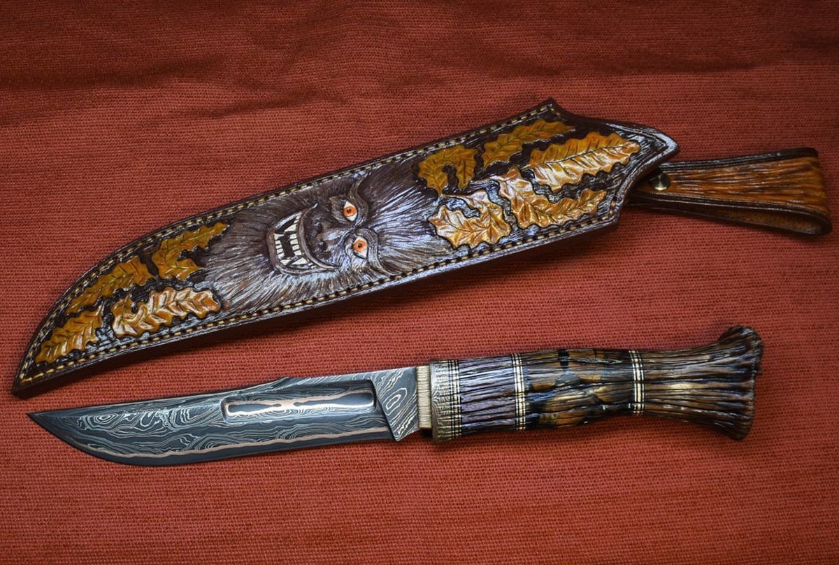 | Описание рукояти: | мокуме, бронза, нейзильбер, стабилизированный бивень мамонта, стабилизированный рог лося и косули, G10, резьба, зрачки глаз рог буйвола |